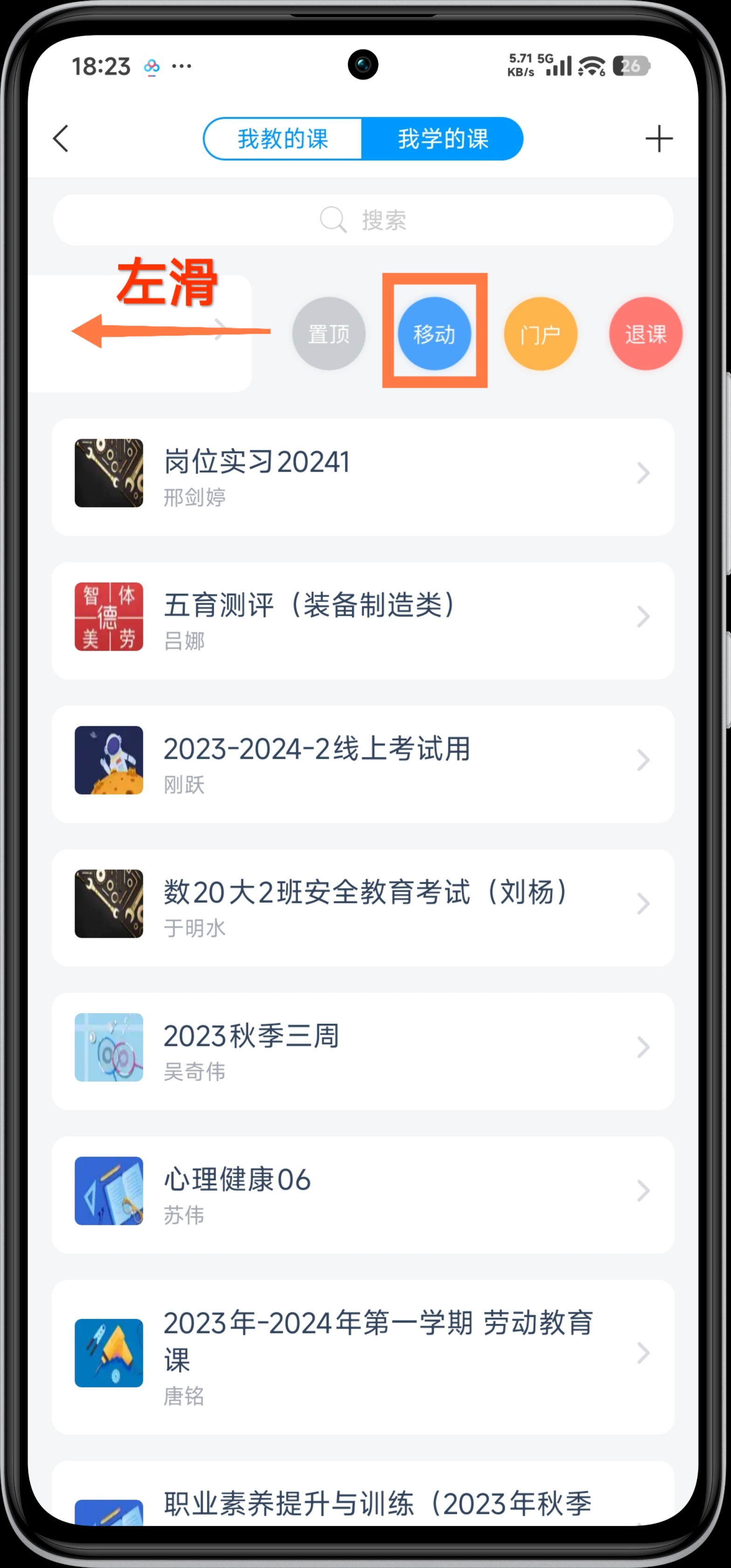 | 学习通APP中打开课程列表页面,找到想要进行签到监控的课程向左划,点击移动 | 如未建立文件夹则点击右上角新建文件夹,否则直接点击对应的文件夹将其移入 | 输入要新建的文件夹名称,只要包含字符串“WAADRI”即可,随后点击建好的文件夹将其移入 | 检查文件夹中是否已包含所有要进行签到监控的课程,最后即可前往网站启动签到监控 |