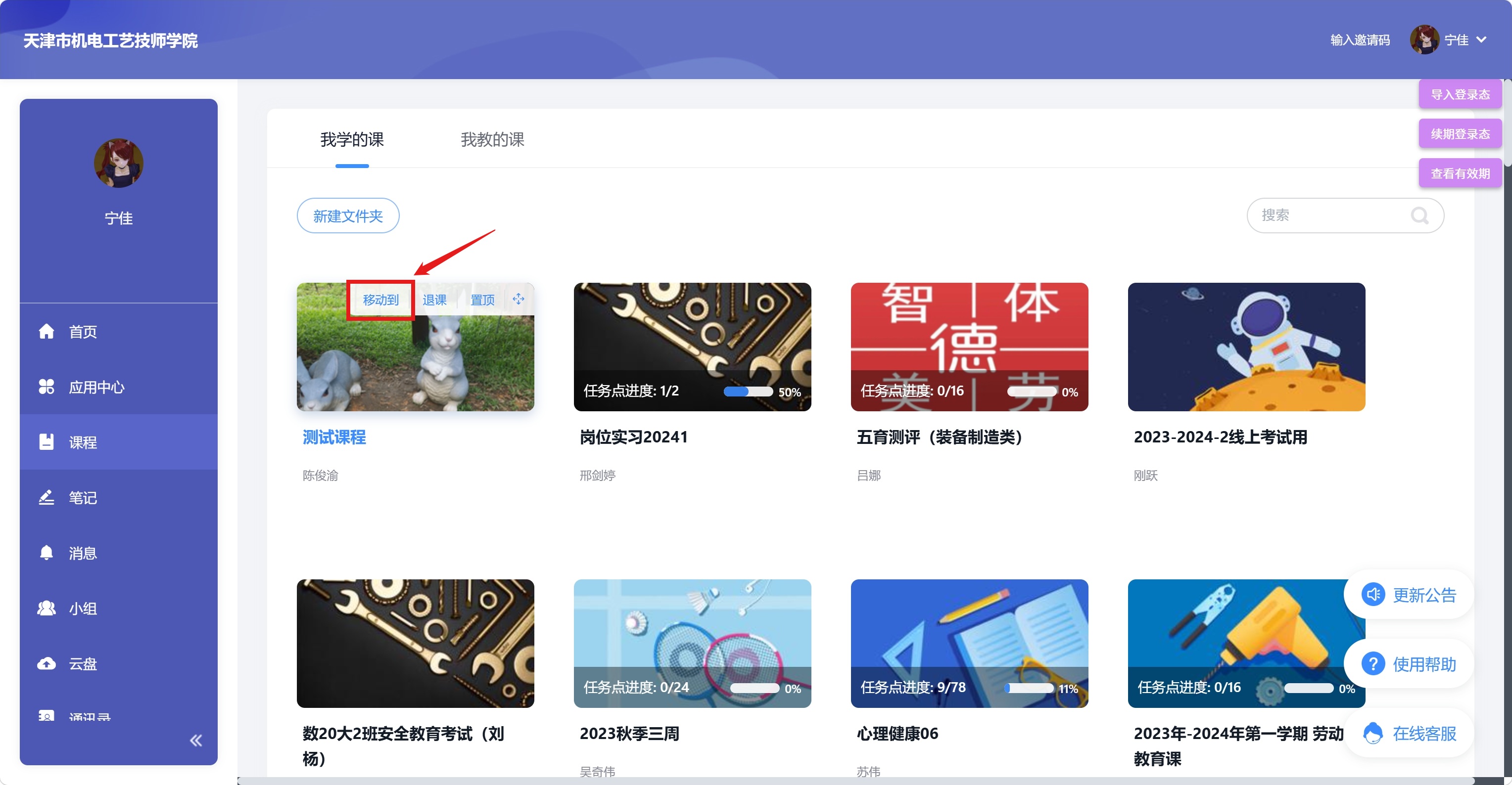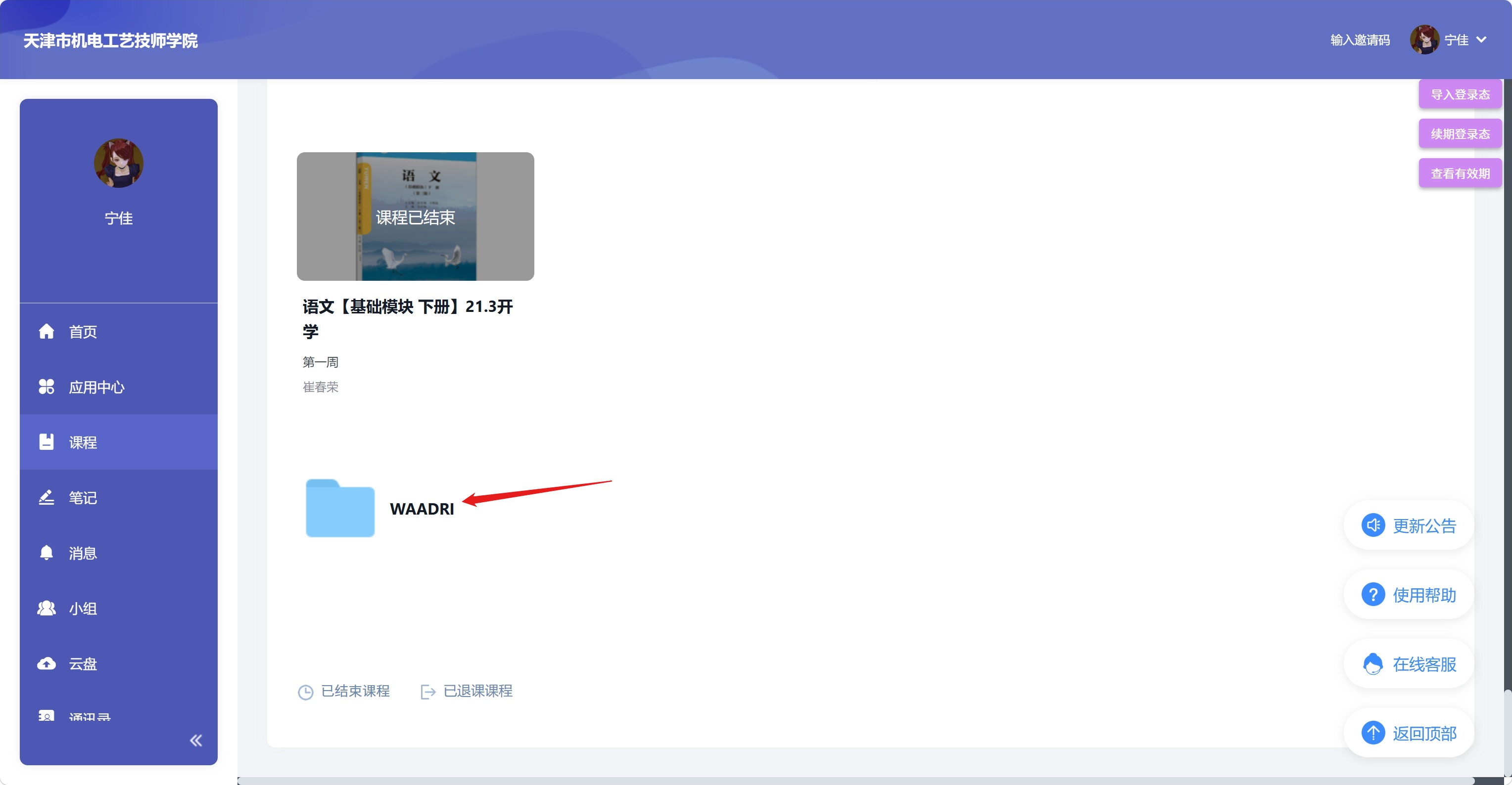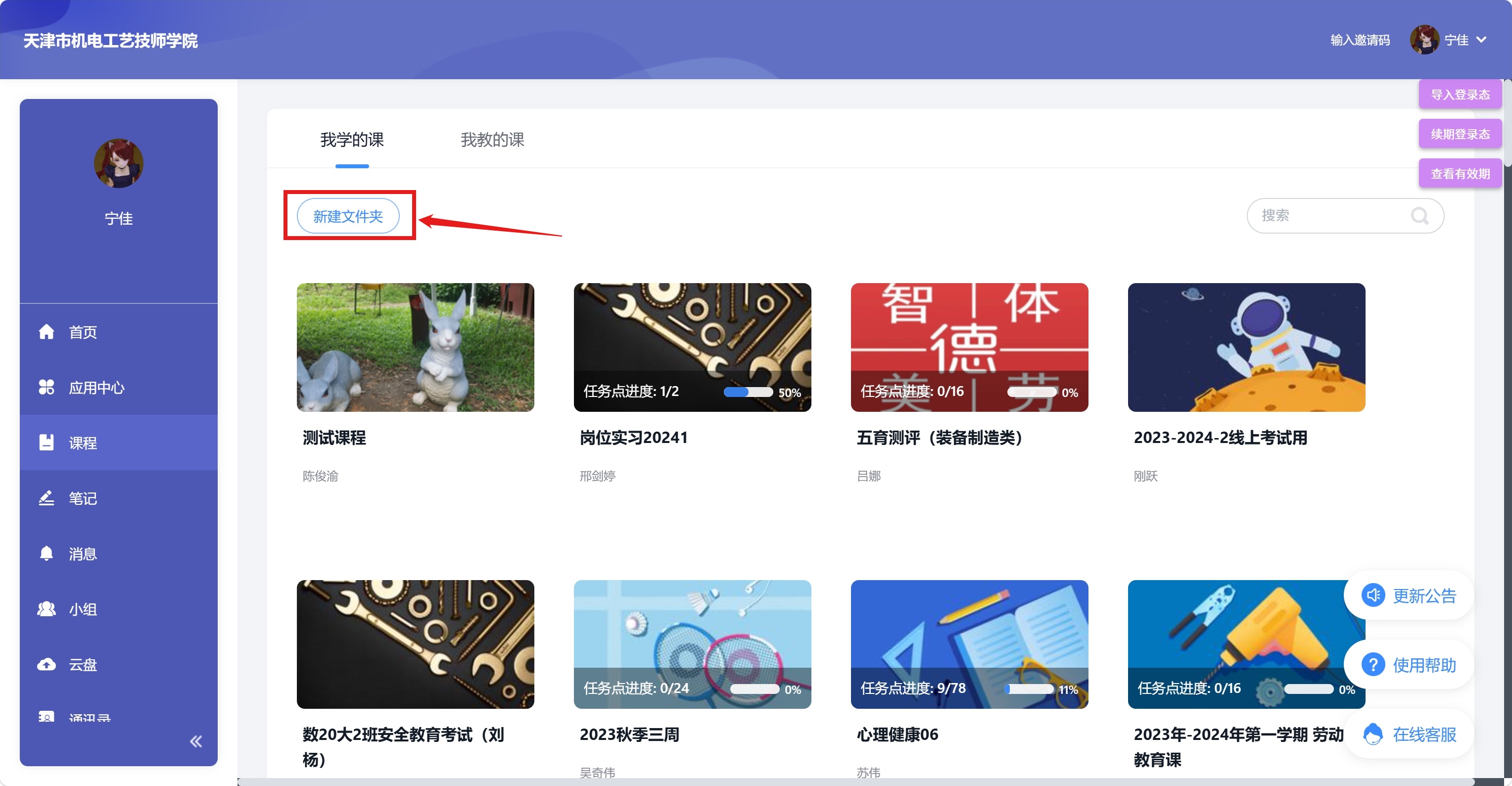 | 打开学习通个人空间页面,左侧点开课程,可以看到所有课程列表,点击最上面的“新建文件夹” | 输入文件夹名称,只要包含字符串“WAADRI”即可 | 将你想要进行签到监控的课程移动至文件夹中 | 检查文件夹中是否已包含所有要进行签到监控的课程,最后即可前往网站启动签到监控 |